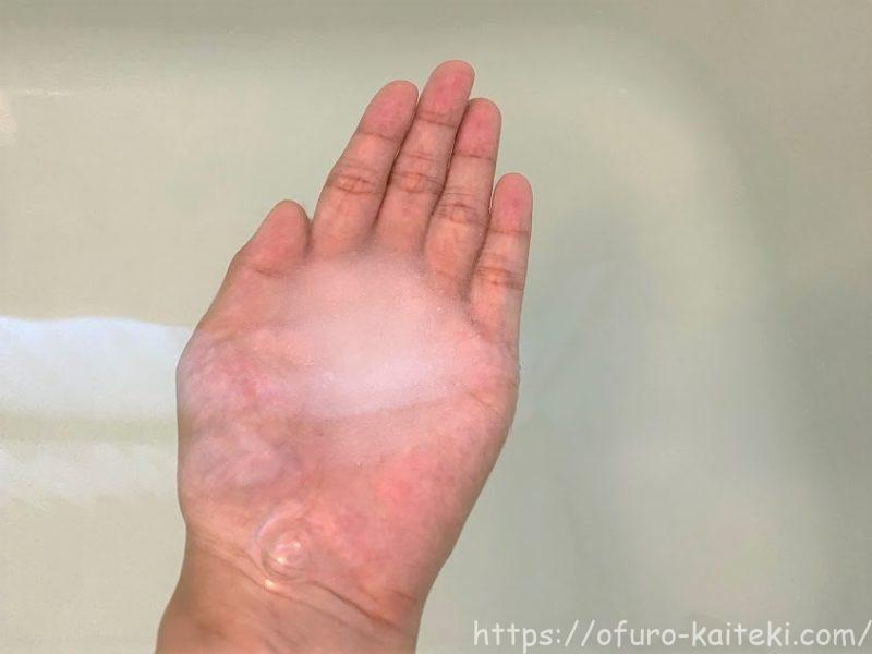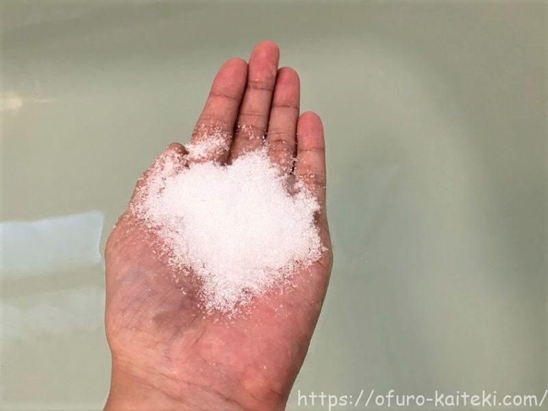 お湯にいれると、さっと溶けて見えなくなります。普通の入浴剤のように色がついたりしないので、入浴剤が入っている感覚はありませんが、湯船に浸かっているとお湯が滑らかになり、柔らかくなったような感じがしました。